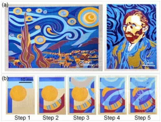 Чтобы показать разнообразие палитры, которую дает такой способ нанесения рисунка, ученые сделали репродукции картин Ван Гога «Звездная ночь» и «Автопортрет» при помощи программируемой автоматизированной лазерной установки.