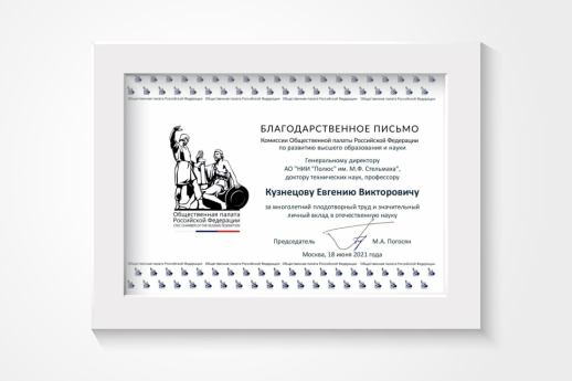 Комиссия Общественной палаты России по развитию высшего образования и науки вручила благодарность генеральному директору ведущего в стране научно-производственного центра по квантовой электронике в составе Холдинга «Швабе» Госкорпорации Ростех.